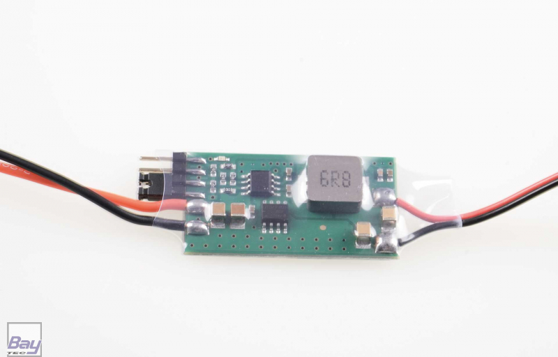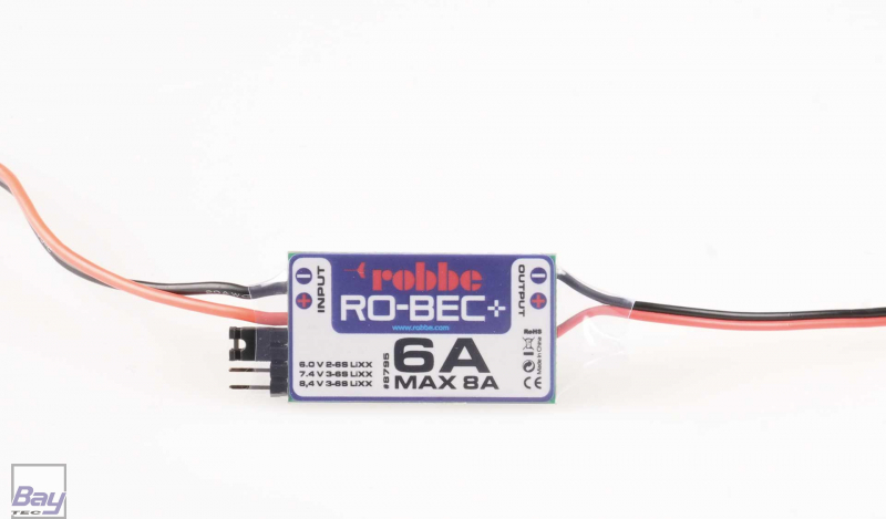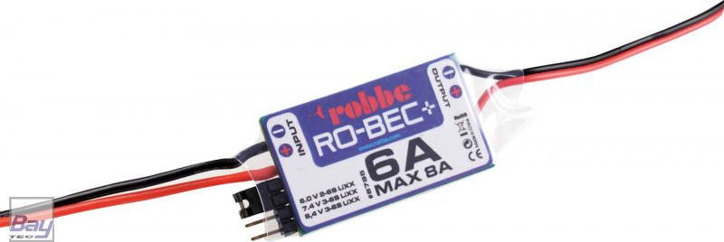 Um den heutigen Anforderungen gerecht zu werden verfügen die getakteten Schalt-BEC´s über eine wählbare Ausgangsspannung von 6, 7,4 oder 8,4V für den Betrieb mit HV Servos. Die RO-BEC´s haben einen breiten Eingangsspannungsbereich von 7-25,5 Volt (2-6S LiPo) und erreichen einen Wirkungsgrad von bis zu 93%. Ausgangsspannung 6, 7,4 od. 8,4V. Die Abmessungen und Gewichte sind sehr geringgehalten, ohne dabei an Sicherheitsfunktionen, wie Überstrom oder -Temperatur zu verzichten. Es stehen drei verschiedene Größen in 4,6,oder 8A zur Verfügung. Wahl d. Ausgangssp.: Jumper.