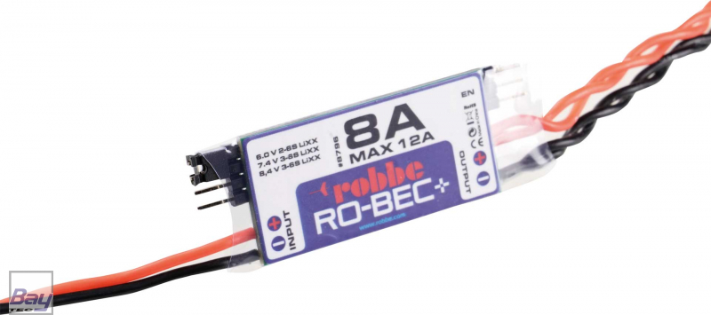Um den heutigen Anforderungen gerecht zu werden verfügen die getakteten Schalt-BEC´s über eine wählbare Ausgangsspannung von 6, 7,4 oder 8,4V für den Betrieb mit HV Servos. Die RO-BEC´s haben einen breiten Eingangsspannungsbereich von 7-25,5 Volt (2-6S LiPo) und erreichen einen Wirkungsgrad von bis zu 93%. Ausgangsspannung 6, 7,4 od. 8,4V. Die Abmessungen und Gewichte sind sehr geringgehalten, ohne dabei an Sicherheitsfunktionen, wie Überstrom oder -Temperatur zu verzichten. Es stehen drei verschiedene Größen in 4,6,oder 8A zur Verfügung. Wahl d. Ausgangssp.: Jumper.