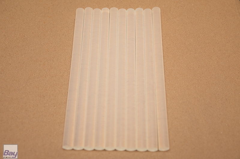 Hier bieten wir Euch passend zur Steckerform Heißklebesticks für Heißklebepistolen an. Diese Sticks sind klar nach dem Aushärten. Für handelsübliche Heißklebepistolen mit Verarbeitungstemperaturen von 170-190°C