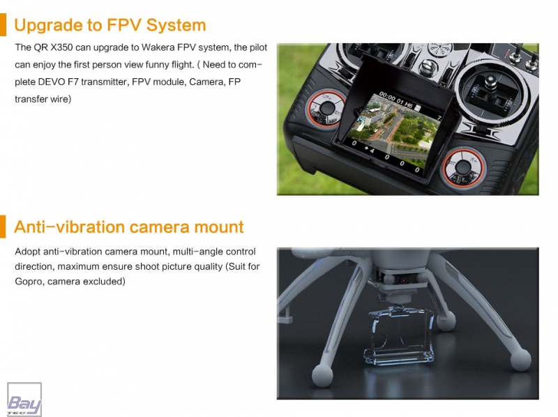 Die GPS Steuereinheit prädestiniert den Walkera QR W 350 vor allem auch für das FPV Fliegen, sprich das Fliegen mittels 5.8 GHZ Videosender und Empfänger. Diese müssten in diesem Fall noch separat dazu erworben werden. Besitzer eine Devo F7 können die Videosignale aber auch direkt auf dem Monitor mit verfolgen. Die Übertragung erfolgt in Echtzeit.
