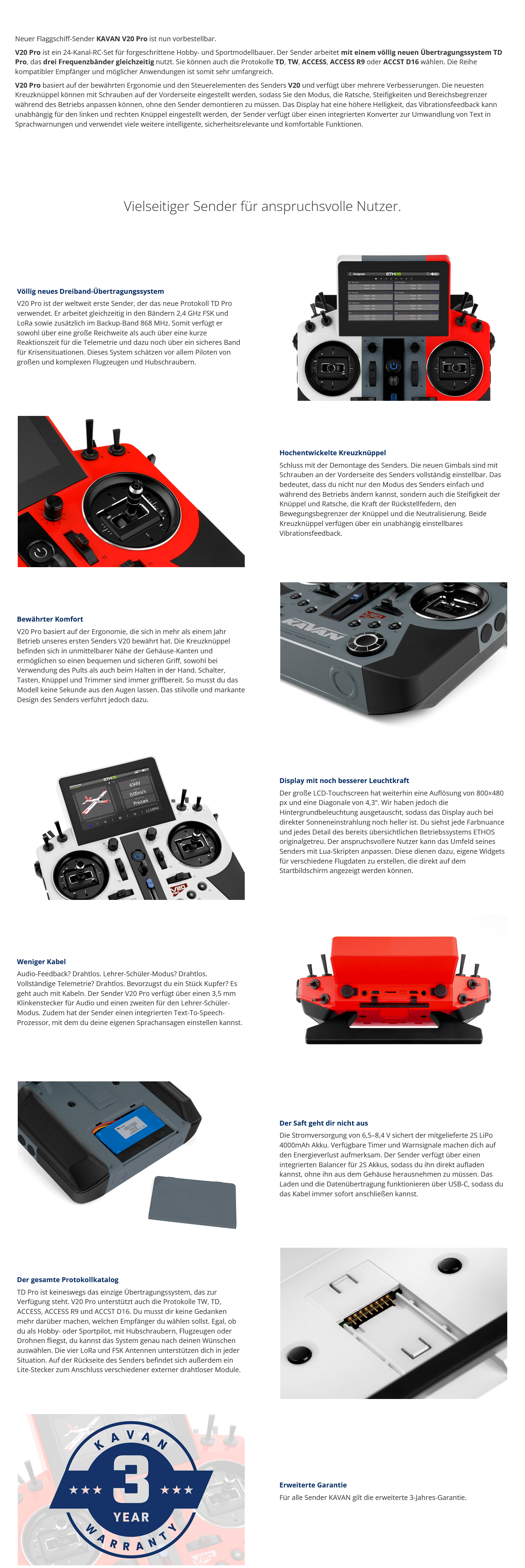 KAVAN V20 Pro ist ein Top 24-Kanal-RC-Set für die anspruchsvollsten Modellbauer, das ein völlig neues Dreiband-Übertragungssystem TD Pro mit vollständiger Telemetrieunterstützung verwendet. Es bietet eine Spitzenreaktionszeit von bis zu 4 ms, über Entfernungen von bis zu Dutzenden von Kilometern. Sie können auch die Übertragungssysteme TW/TD/ACCESS/ACCESS R9/ACCST D16 wählen, ebenfalls mit Telemetrie. V20 Pro kann also mit vielen KAVAN oder FrSky Empfängern verbunden werden, mit oder ohne Telemetrie, mit klassischen PWM- und S.BUS-Ausgängen.