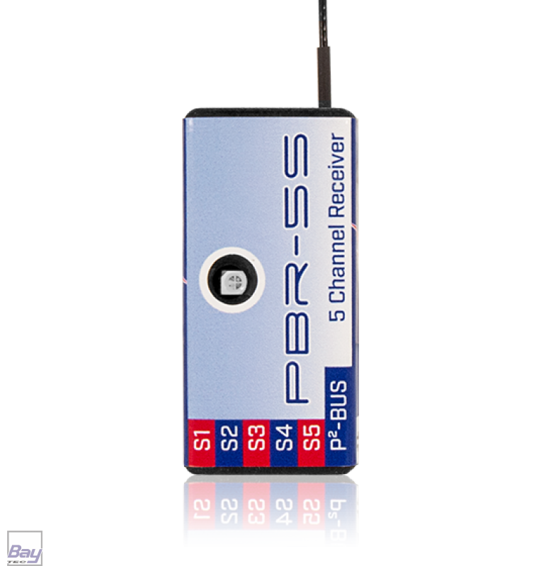 PBR-5S Ist ein 5 Kanal Empfänger mit einem Empfangsteil mit integrierter Chipantenne. Der Empfänger besitzt eine P²-BUS Schnittstelle für Servo- und Telemetrie Daten und ist aufgrund seiner minimalen Größe für kleine Modelle bestens geeignet.