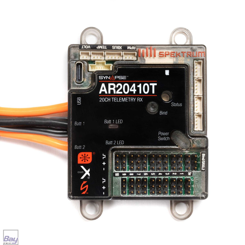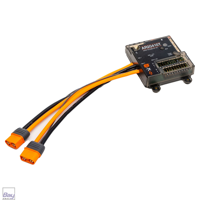 Der Spektrum™ AR20410T PowerSafe™ Empfänger ist ein funktionsreicher 20-Kanal-Empfänger mit Full-Range-Telemetrie. Spektrum PowerSafe Empfänger sind für Modelle mit zahlreichen Servos und Zubehör konzipiert, die u.U. übermäßig viel Strom ziehen, wie sie bei Groß- und Jetmodellen zu finden sind. Sie verfügen über robuste Steckverbindungen, die für Hochstrombelastungen ausgelegt sind und über zwei 13AWG-Akkueingangskabel mit IC3™-Anschlüssen für die Verwendung mit größeren Akkupacks verfügen. Dadurch ist es möglich, auch starke Verbraucher direkt über den Empfänger zu betreiben, ohne dass ein separates Stromversorgungssystem erforderlich ist. Zusätzlich sind jetzt innovative Funktionen wie schneller Reboot, regenerative Servo-Unterstützung, Remote-Schlafmodus und Kompatibilität mit dem brandneuen Synapse AS3X+ / SAFE-Modul enthalten.