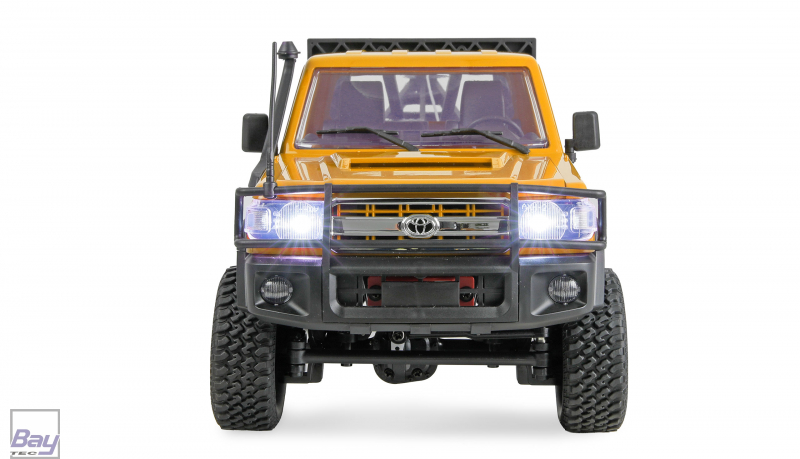 Der ferngesteuerte Toyota Land Cruiser Crawler Abschleppwagen im Maßstab 1:12 überzeugt als detailgetreues Scale-Lizenzmodell und verbindet einen authentischen Auftritt mit präzisen, proportionalen Fahrfunktionen. Dank Mountainbreak bleibt das Fahrzeug auch an steilen Passagen kontrollierbar, was es besonders für anspruchsvolles Gelände prädestiniert. Der kraftvolle 4WD-Antrieb, zwei schaltbare Geschwindigkeiten sowie einstellbare Stoßdämpfer hinten in Kombination mit Blattfedern sorgen für ein ausgewogenes Fahrverhalten und hohe Traktion auf verschiedensten Untergründen.