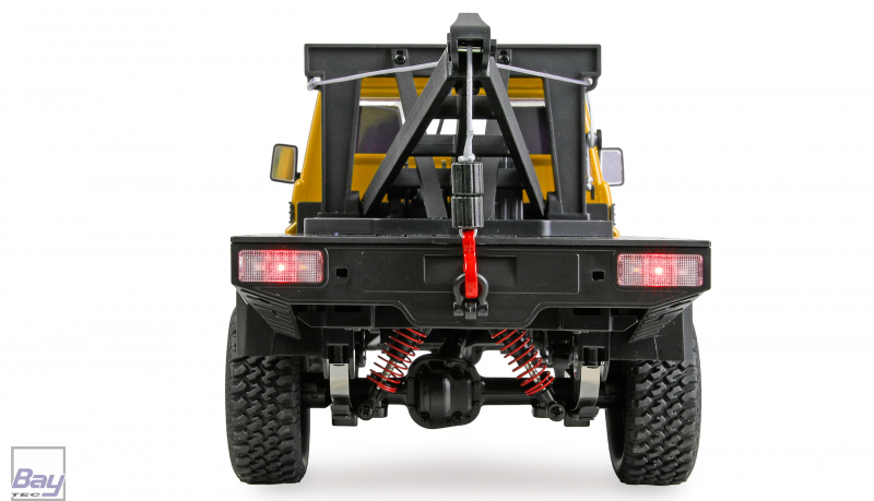 Über Fernsteuerung schaltbare elektronische Winde auf der Ladefläche mit Metallhaken: Ermöglicht das realistische Bergen von Lasten, ohne manuell eingreifen zu müssen. Der robuste Metallhaken sorgt dabei für zuverlässiges Greifen und hohe Zugkraft