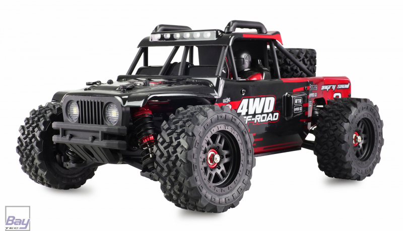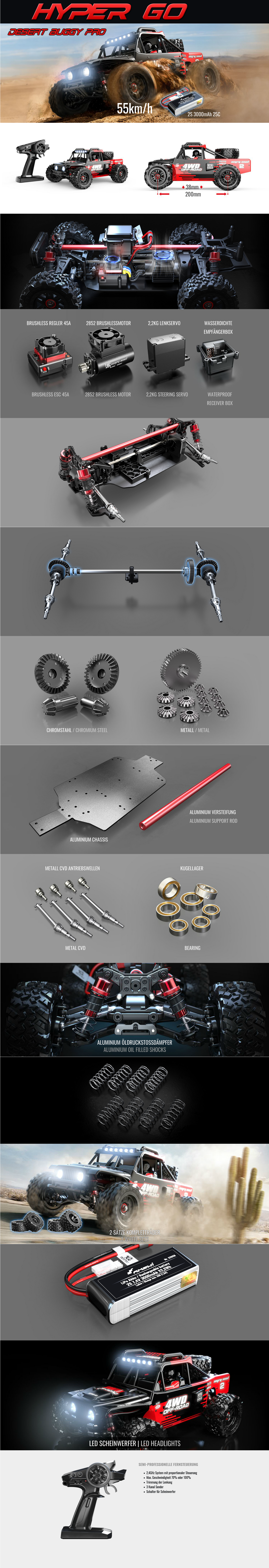 Der Hyper Go Desert Buggy im Maßstab 1:14 kommt dank seines brachialen Antriebes auf 55km/h Top-Speed. Hochwertige Komponenten wie die Aluminium-Öldruck-Stoßdämpfer, Metall-CVD-Antriebswellen, -Kardanwellen, -Getriebe und -Differentiale sorgen für eine hohe Langlebigkeit dieses Offroad-Racers. Ein aktiver Lüfter am Motor ermöglicht optimale Kühlung. Das einstellbare Fahrwerk, welches auf einer Aluminium-Chassisplatte sitzt, sorgt für extreme Spurtreue.