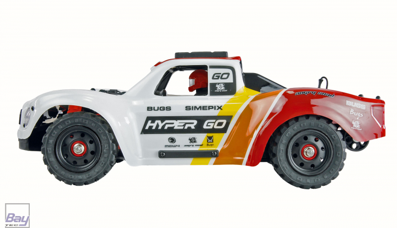 Der Hyper GO Short Course Truck im Maßstab 1:14 ist ein leistungsstarkes RC-Modell, das mit Robustheit und vielseitigen Fahreigenschaften überzeugt: Dank des komplett kugelgelagerten 4WD-Antriebs, Brushless-Motors und Brushless-ESC 2-3S 45A erreicht das Fahrzeug eine hohe Effizienz und eine beeindruckende Performance. In Kombination mit einem optionalen 3S LiPo Akku sind Geschwindigkeiten von bis zu 70 km/h möglich, wobei die Dual-Rate-Funktion an der Fernsteuerung eine stufenlose Anpassung der Geschwindigkeit erlaubt. Für ein stabiles Fahrverhalten sorgen die Aluminium-Chassisplatte, das einstellbare Fahrwerk mit Öldruck-Stoßdämpfern sowie eine integrierte Gyro-Stabilisierung, die das Handling auch bei hohen Geschwindigkeiten unterstützt. Alle Antriebskomponenten wie Getriebe und Differential sind aus Metall gefertigt, ebenso die CVD-Teleskop-Antriebswellen, was für eine hohe Langlebigkeit und Belastbarkeit selbst im harten Offroad-Einsatz steht. Die robuste Polycarbonat-Karosserie mit Fahrerfigur und Beifahrer schützt die Technik und sorgt zugleich für eine realistische Optik. Zusätzlich ist das Modell mit einer schaltbaren LED-Beleuchtung ausgestattet und verfügt über eine Wheelie-Bar für dynamische Beschleunigungsmanöver. Die spritzwassergeschützte Elektronik ermöglicht den Einsatz bei nahezu jedem Wetter. Das RTR-Set wird komplett fahrfertig geliefert und enthält neben der 2,4-GHz-Fernsteuerung auch Akku, Ladekabel sowie einen zusätzlichen Satz Offroad-Reifen mit weißen Felgen, sodass sofort nach dem Auspacken der Fahrspaß beginnen kann