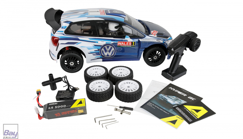 Das Hyper Go VW Polo WRC Rallye wird als ARTR-Version inklusive Fernsteuerung sowie zwei Reifensätzen für Onroad- und Rallyeeinsätze geliefert. Das verstellbare Akkufach erlaubt die Nutzung verschiedener Akkugrößen (3-4S LiPo 4000-6000mAh min. 35C, XT60-Anschluss), während die wasserdichte Empfängerbox die Elektronik vor Nässe schützt. Aluminium-Öldruck-Stoßdämpfer, vollständig kugelgelagerte Komponenten und CVD-Antriebswellen sorgen für exzellentes Fahrverhalten und Langlebigkeit. Ein 35kg starkes Lenkservo mit Metallgetriebe sowie die 2,4GHz Fernsteuerung mit Dual Rate und Reverse-Funktion für Gas und Lenkung ermöglichen präzise Kontrolle in jeder Fahrsituation. Das Hyper Go VW Polo WRC Rallye vereint hohe Stabilität, Leistung und Detailtreue in einem hochwertigen Modellauto, das für anspruchsvolle Rallye-Fahrten auf verschiedenen Untergründen ausgelegt ist.