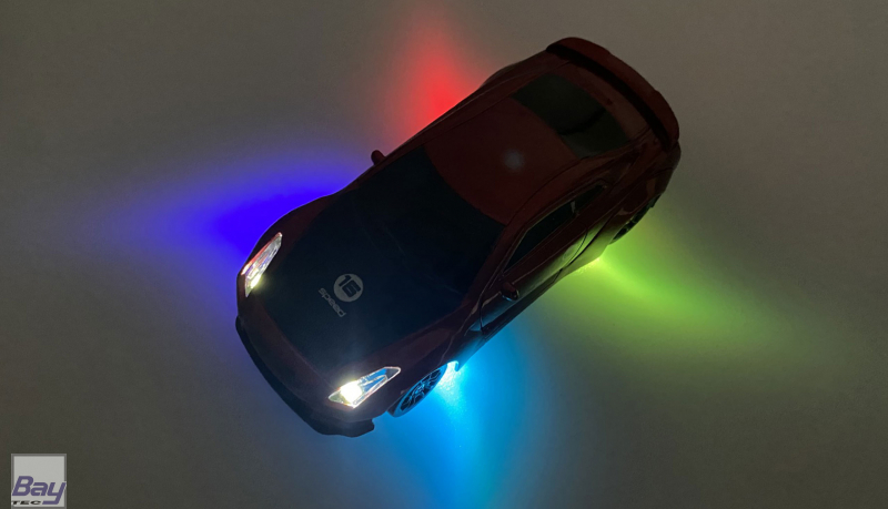 Für visuelle Akzente sorgt die LED-Beleuchtung: Die Front- und Rückleuchten leuchten dauerhaft, während die Unterbodenbeleuchtung nach Wunsch zugeschaltet werden kann. So wird das Fahrerlebnis auch optisch eindrucksvoll. Das Drift Sport GTR erreicht Geschwindigkeiten von bis zu 15 km/h und bietet dank des integrierten LiPo-Akkus Fahrzeiten von etwa 20 Minuten. Eine Unterspannungswarnung schützt den Akku vor Tiefentladung. Über die eingebaute USB-C-Ladebuchse lässt sich der Akku in rund 30 Minuten wieder aufladen, das passende USB-Kabel ist im Lieferumfang enthalten.