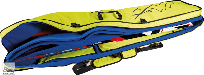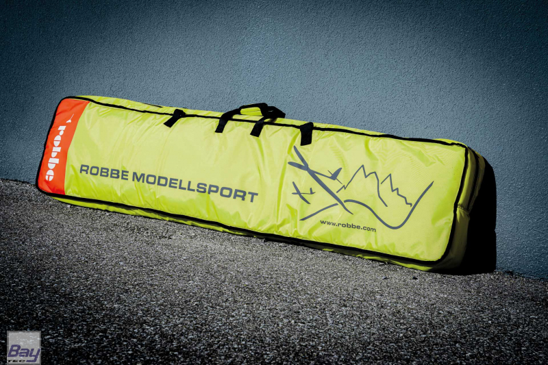 Somit können Modelle wie Robbe „Evoa“, "Avalanche" und ähnliche vollständig mit Rumpf und Leitwerk sicher transportiert und aufbewahrt werden. Das Außenmaterial ist auf der Innenseite mit einem weichen Futter vernäht. Für die Flächenverbinder verfügt die Tasche über ein separates Fach mit Reißverschluss, ebenso wie für eine Höheleitwerk in der Größe des Modells "Evoa" um Beschädigungen zwischen Rumpf und Tragfläche zu vermeiden, ist die Tasche mit 3 weichen Trennungen versehen. Zum ausbalancierten Tragen ist ein verstellbarer, mit Karabiner abnehmbarer Umhängegurt vorhanden, ebenso wie zwei normale Handgriffe. Die Tasche besteht aus wasserabweisenden Rucksackmaterial und ist im gefälligem Robbe Design bedruckt.