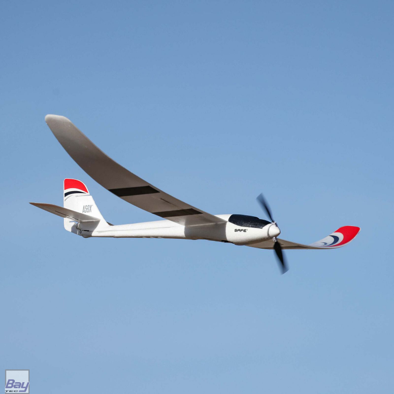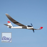 Der werkseitig installierte Antrieb besteht aus einem Coreless-Motor mit Getriebe und einer effizienten Klappluftschraube. Damit hat das Modell eine hervorragende Steigleistung und bietet bei gemischtem Motor-/Segelbetrieb lange Flugzeiten von bis zu 10-20+ Minuten bei Einsatz eines 1S 150-200mAh Akkus.