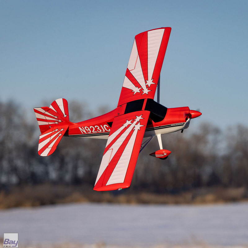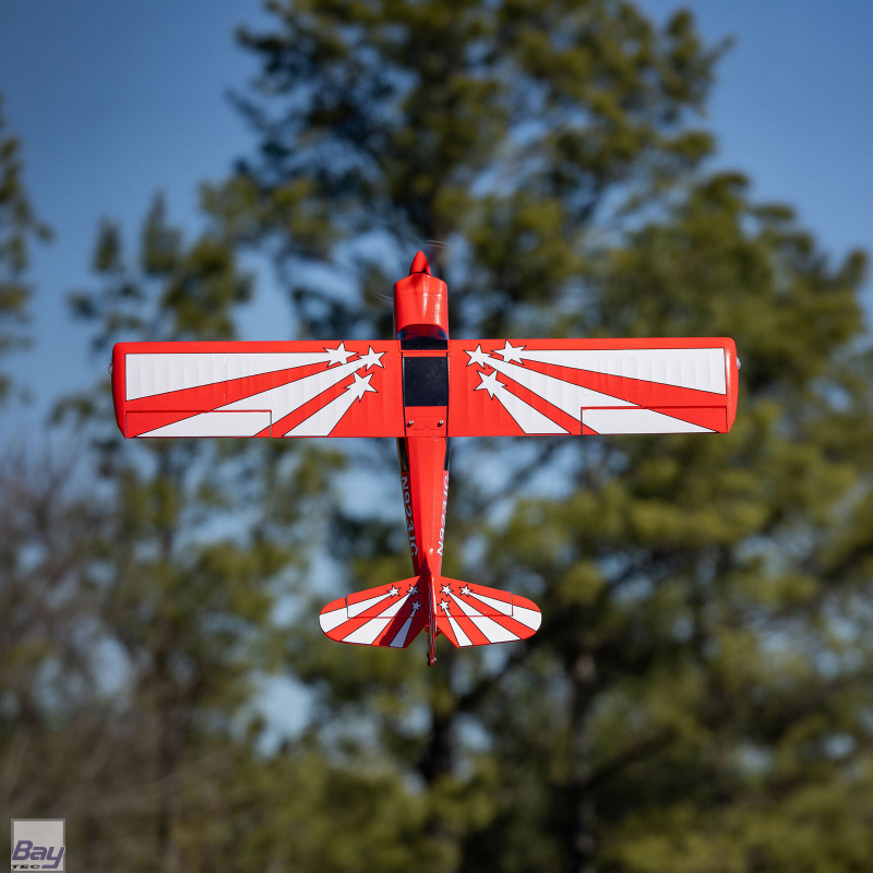 Fabrikmäßig fertiggestellt im klassischen Rot-Weiß-Schwarz-Design mit „Starburst“-Akzenten, das sofort an die originalen Super Decathlon Flugzeuge im Scale 1:1 erinnert.