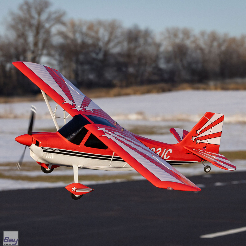 Mache den nächsten Schritt, verbessere deine Fähigkeiten und zeige beeindruckende Kunstflugmanöver – mit der E-flite® Super Decathlon 1,2 m! Dieses Modell gehört zu den leistungsfähigsten und am besten steuerbaren Nachbildungen des klassischen Kunstflugtrainers. Wie die originale Decathlon RJG 1,2 m ist auch dieses Modell eine detailgetreue Nachbildung der Luftfahrt-Ikone, die sowohl von Profis auf Flugshows als auch von Piloten genutzt wird, die an ihrem lokalen Flugplatz Kunstflug erlernen. Die Super Decathlon kommt ab Werk im beliebten und unverkennbaren rot-weiß-schwarzen „Starburst“-Design und bietet zahlreiche Scale-Details wie funktionale LED-Lande- und Navigationslichter, Radverkleidungen und Flügelstreben. Der einteilige Flügel lässt sich dank werkzeugloser Verbindungen und Rändelschrauben einfach montieren und demontieren. Die Streben können ohne zusätzliche Befestigungen oder Werkzeuge ein- und ausgeklinkt werden. Trotz ihrer praktischen Größe, die eine einfache Lagerung und den Transport ohne Demontage ermöglicht, bietet sie beeindruckende Flugleistungen. Verbesserte digitale Servos mit Metallgetriebe und Kugelgelenk-Anlenkung sorgen für noch präzisere und zuverlässigere Steuerung – ideal für sanften Sportflug bis hin zu aggressiven Kunstflugmanövern. Beide Versionen des Modells verfügen über ein leistungsstarkes Antriebssystem, das mit 3S- und 4S-LiPo-Akkus (2200–3200 mAh) kompatibel ist, sowie einen 45-Ampere Spektrum™ Avian™ Smart Lite ESC. Die BNF Basic-Version ist zusätzlich mit einem verbesserten AR631+ Empfänger ausgestattet, der Echtzeit-Telemetriedaten liefert, AS3X+ Stabilisierung, optional nutzbare SAFE Select-Technologie, Motorumkehr und eine praktische Fernsteuerung Programmierung bietet. All diese Details und Funktionen machen die E-flite® Super Decathlon 1,2 m zu einem vielseitigen und leistungsstarken Modell, das sowohl für Piloten mit wenig Flugerfahrung als auch für fortgeschrittene und erfahrene Piloten eine ausgezeichnete Wahl ist!