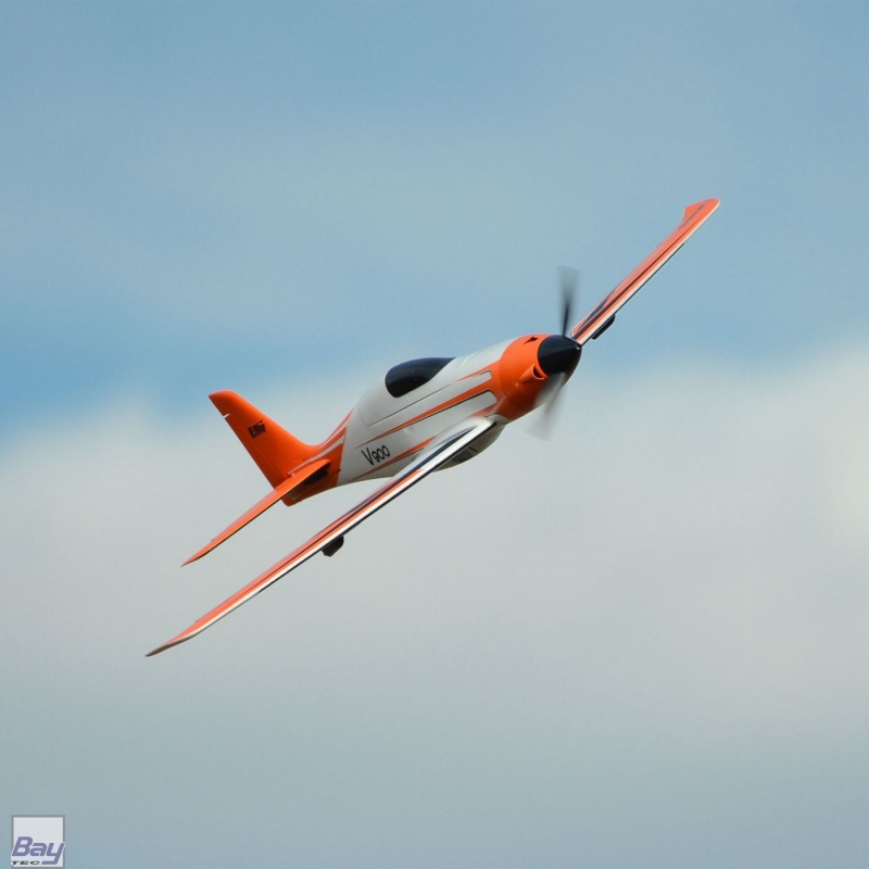 Die V900 ist aktuell das schnellste E-flite Flugzeug. Aus der Box heraus erreicht die V900 mit 3S 160km/h und bei 4S satte 192 km/h. Die verstärkte EPO Konstruktion unterstützt das auf Highspeed optimierte Rumpfdesign und die auffällige Lackierung sorgt schon am Boden für den entsprechenden Eindruck.