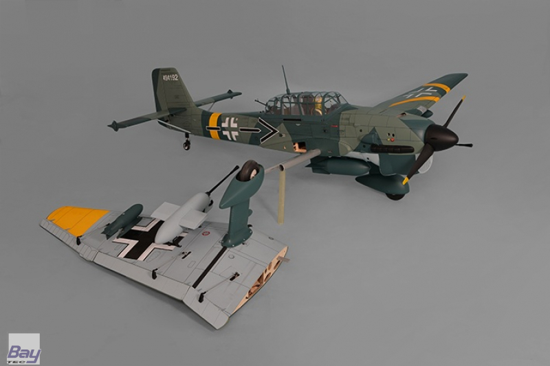 Konzipiert ist die Phoenix Stuka Ju87 für einen 82 mm Brushless Motor oder einen 50 - 60ccm Verbrennungsmotor. Der Zugang zum Antriebsakku erfolgt durch die abnehmbare Kabinenhaube. Alle für den Aufbau benötigten Hardware Teile sind - genau wie der Scale Spinner, die Scale Antenne, Scale Bewaffnung und vieles mehr - im Lieferumfang enthalten.