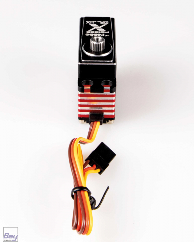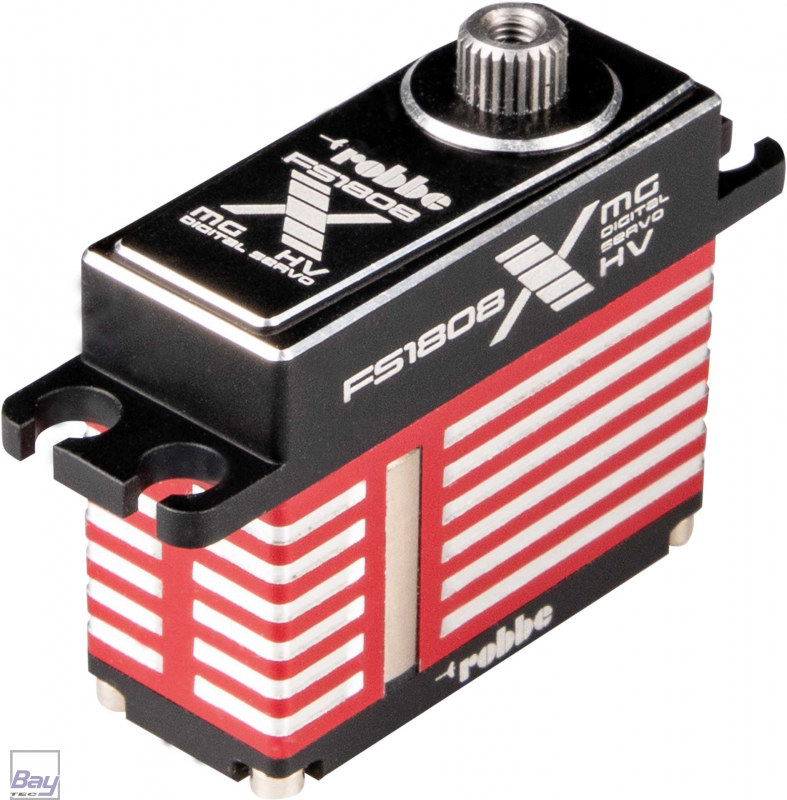 Das Robbe FS 1808X ist ein außerordentlich starkes, extrem schnelles und robustes Midi-Servo im kompakten, CNC gefrästen Aluminiumgehäuse mit gefrästen Kühlrippen für eine bessere Wärmeableitung. Es verfügt über ein stabiles und zugleich spielfreies Metallgetriebe und Kugellagerung am Abtrieb. Das FS 1808X verfügt über eine enorm hohe Stellkraft von 18 kg/cm bei 8,4 Volt und extrem niedriger Stellzeit. Es kann daher besonders gut in 3D- und Kunstflugmodellen der 60-78“ Klasse auf allen Rudern verwendet werden. Aber auch als gewichtsoptimierter Ersatz von Standardservos in Großmodellen oder Jets ist es hervorragend geeignet.