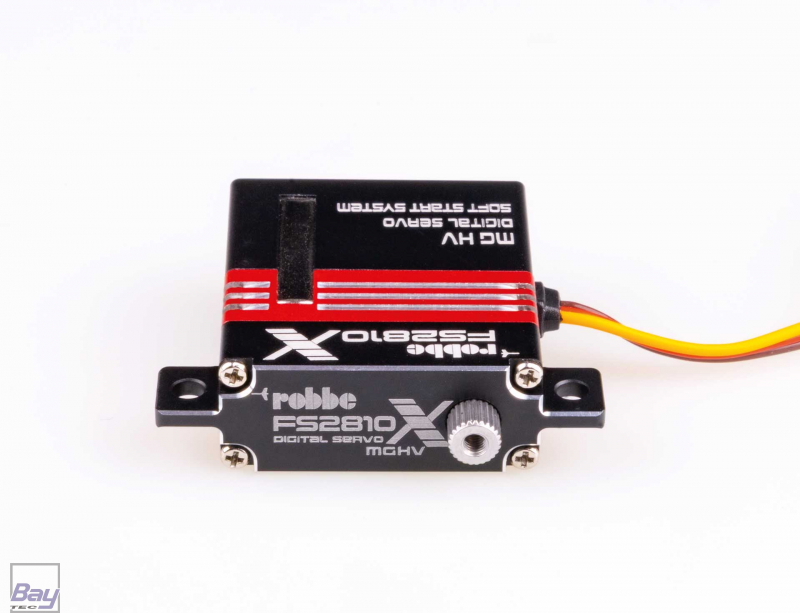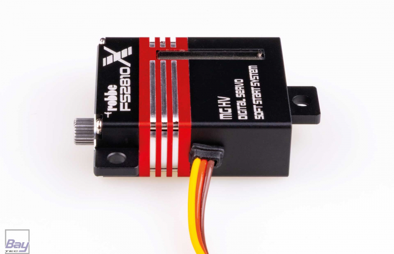 Das Robbe FS 2810X ist ein außerordentlich starkes, schnelles und robustes Flächen-Servo im kompakten, CNC gefrästen Aluminiumgehäuse mit gefrästen Kühlrippen für eine bessere Wärmeableitung. Es verfügt über ein stabiles und zugleich spielfreies Metallgetriebe und Kugellagerung am Abtrieb. Das FS 2810X verfügt über eine enorm hohe Stellkraft von 28 kg/cm bei 8,4 Volt und niedriger Stellzeit. Es eignet sich besonders als Querruder oder Wölbklappenservo in Tragflächen mit geringen Profiltiefen, wo dennoch höchste Kraft benötigt wird.
